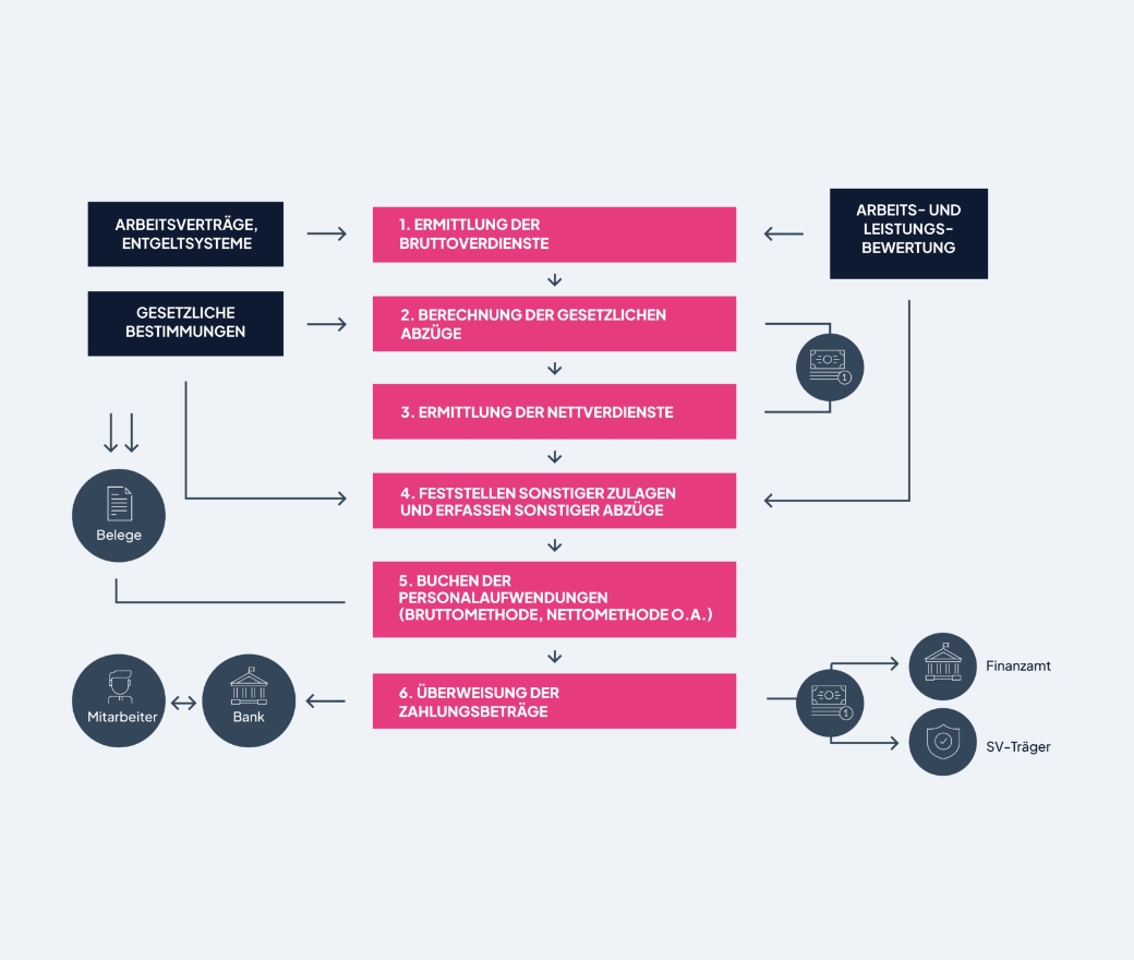Um das Potenzial Ihrer Mitarbeiter voll auszuschöpfen, müssen Sie eine Analyse der Prozesse Ihrer Entgeltabrechnung durchführen. Dazu gehören alle vorgelagerten Prozesse der Entgeltabrechnung. Doch auch die nachbereitenden entgeltrelevanten Tätigkeiten müssen bei der Analyse berücksichtigt werden. Nur so können Sie schnell und zielsicher den Optimierungsbedarf in Zeit-, Daten- und Fehlzeitenmanagement sowie in allen anderen Prozessen der Entgeltabrechnung berücksichtigen.