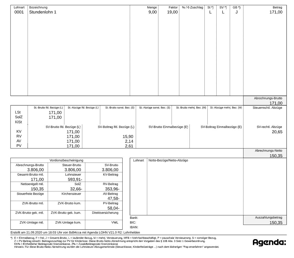 Anschließend führen Sie auf der Gehaltsabrechnung, die Sie erstellen, das Nettoentgelt an. Das Nettogehalt ist das, was nach den Abzügen von Steuer und Sozialversicherung vom Bruttobetrag übrig bleibt. Doch Vorsicht: Nicht immer ist der Nettobetrag mit dem Auszahlungsbetrag identisch.