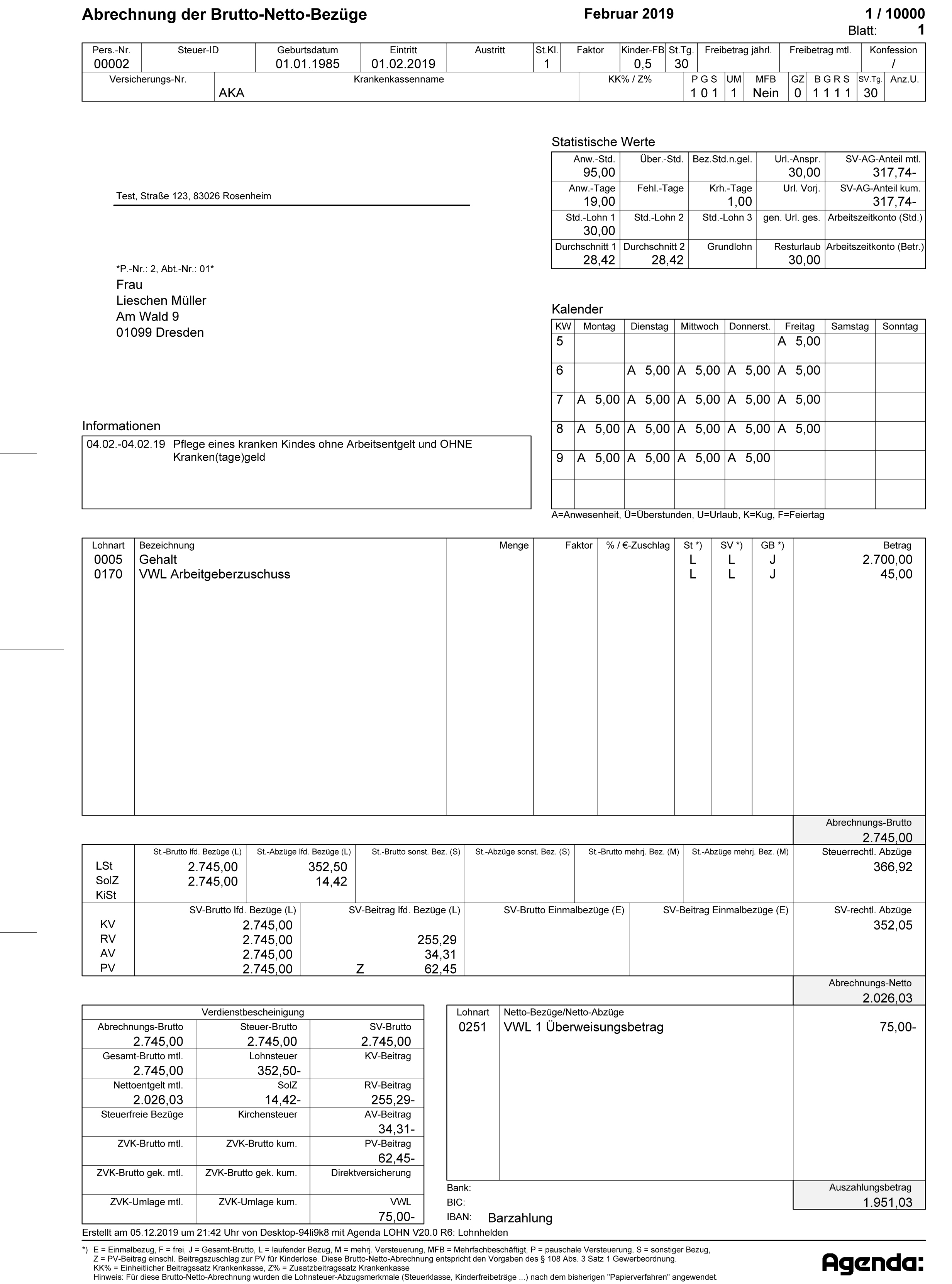 Ebenfalls nicht enthalten sind in unserer Muster Gehaltsabrechnungen Sonderzahlungen (etwa für die Betriebsangehörigkeit) sowie steuerfreie Verpflegungspauschalen für Dienstreisen im In- und Ausland. In der Praxis müssen aber selbstverständlich auch diese Entgeltbestandteile bei der Erstellung von Gehaltsabrechnungen berücksichtigt werden, um jederzeit eine korrekte Abrechnung zu gewährleisten.